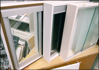 Saatavilla erivärisiä peilejä, maalattuja laseja ja levyvaihtoehtoja. Kehykset eloksoitua tai maalattua alumiinia.